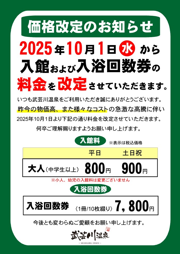 昨今の物価上昇により、誠に心苦しいお知らせではございますが、